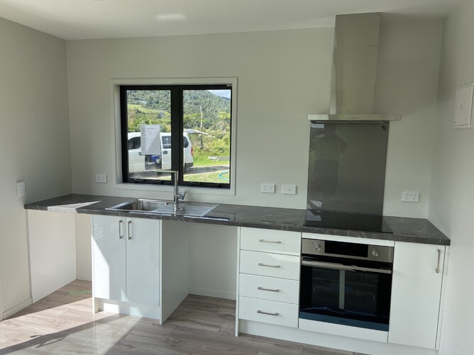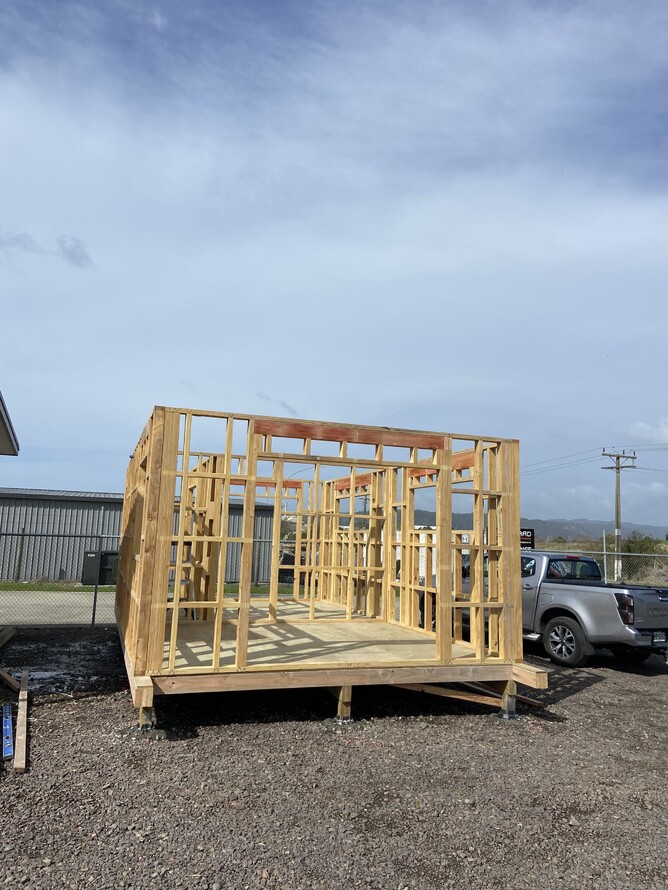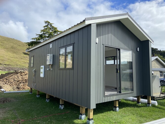 The custom-built Motu home, featuring a single bedroom, bathroom, and kitchen, is ideal for use as a bach, sleepout, or Airbnb cabin. With a total floor area of 28.8m2, it offers a compact yet functional living space with all the mod cons. McDowell, owner of Kiwi Country Construction, is personally building the home during weekends and after work hours.